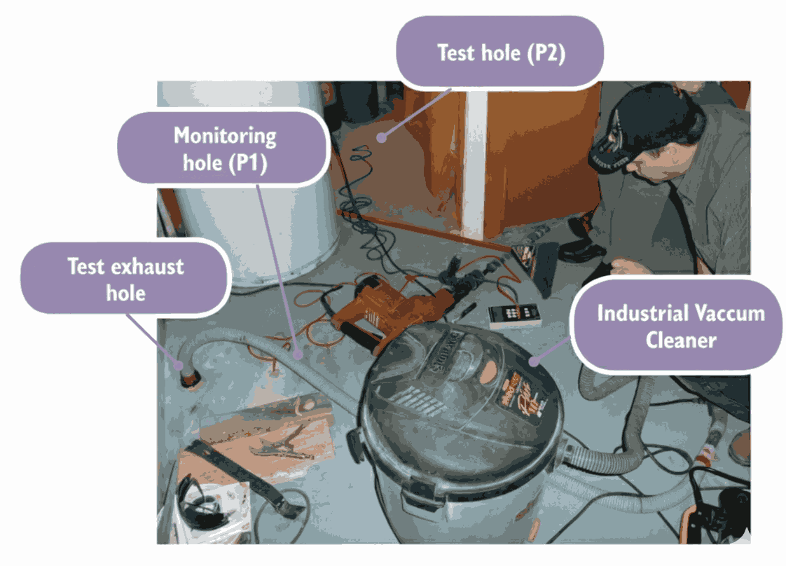 The pressure difference between the extraction point and the small test holes is measured to determine how well air can move beneath the slab - this is referred to as connectivity.