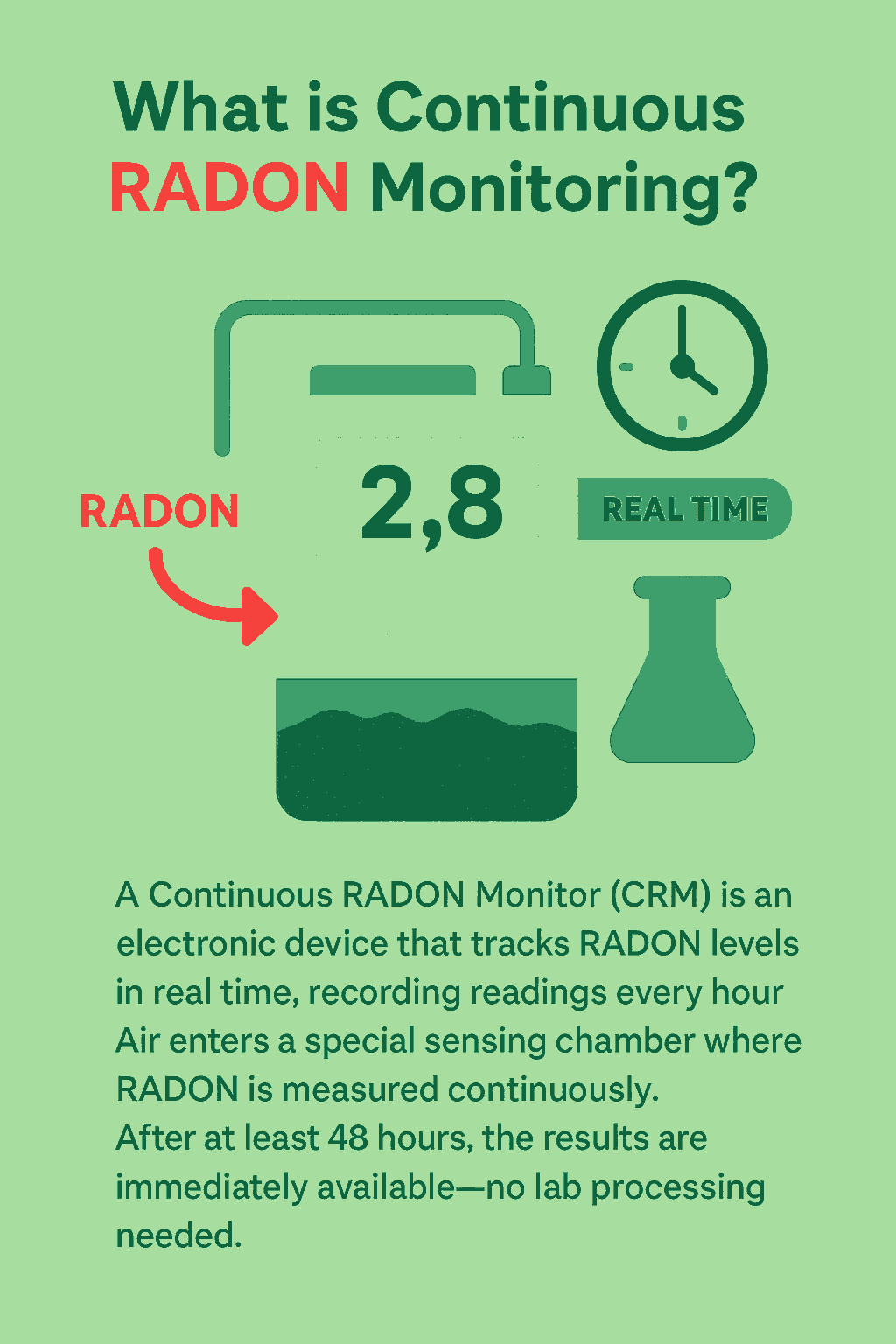 A Continuous RADON Monitor (CRM) is an electronic device that tracks RADON levels in real time, recording readings every hour. Air enters a special sensing chamber where RADON is measured continuously. After at least 48 hours, the results are immediately available-no lab processing needed.