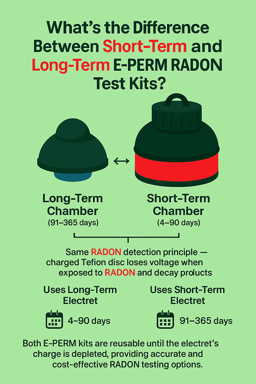 Both types are reusable until the electret’s charge is fully depleted, providing accurate and cost-effective RADON measurement options for different testing durations.