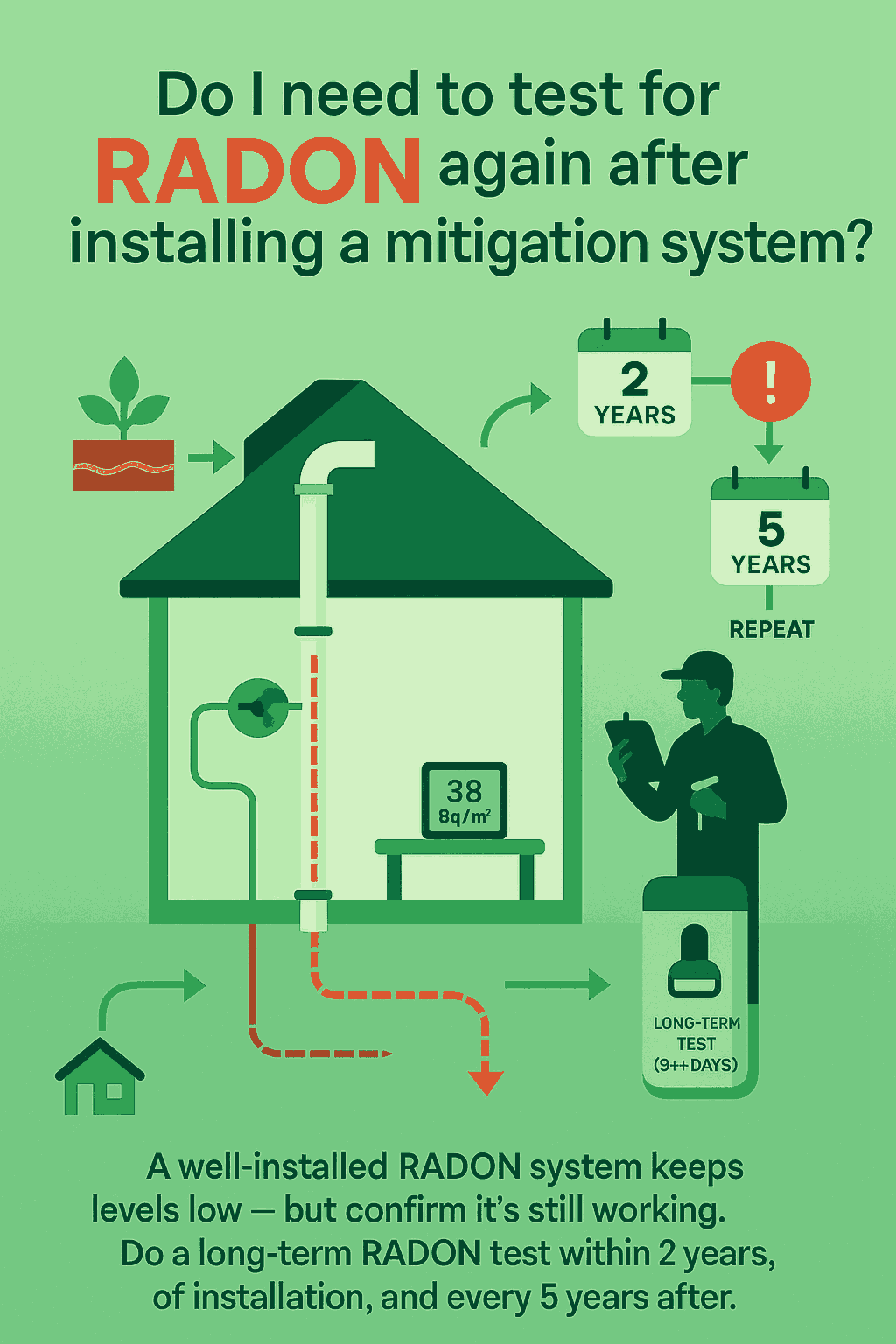 To confirm continued performance, it’s recommended to do a long-term RADON test within two years of installation, and every five years after that.