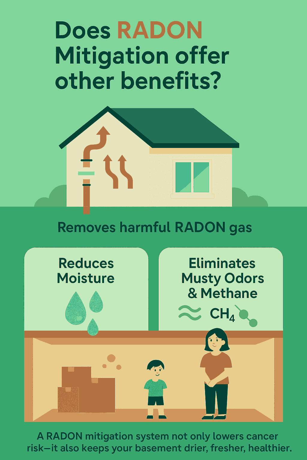 Yes. Besides reducing the risk of lung cancer, a RADON mitigation system can also help remove excess moisture, methane, and other soil gases from your home.