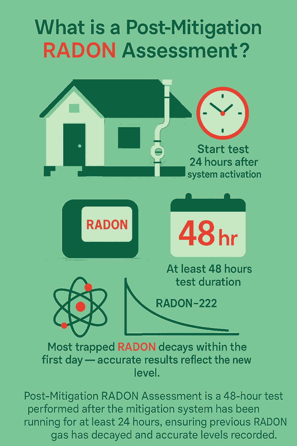 A Post-Mitigation RADON Assessment is a follow-up test done after installing a mitigation system to confirm that RADON levels have been effectively reduced.