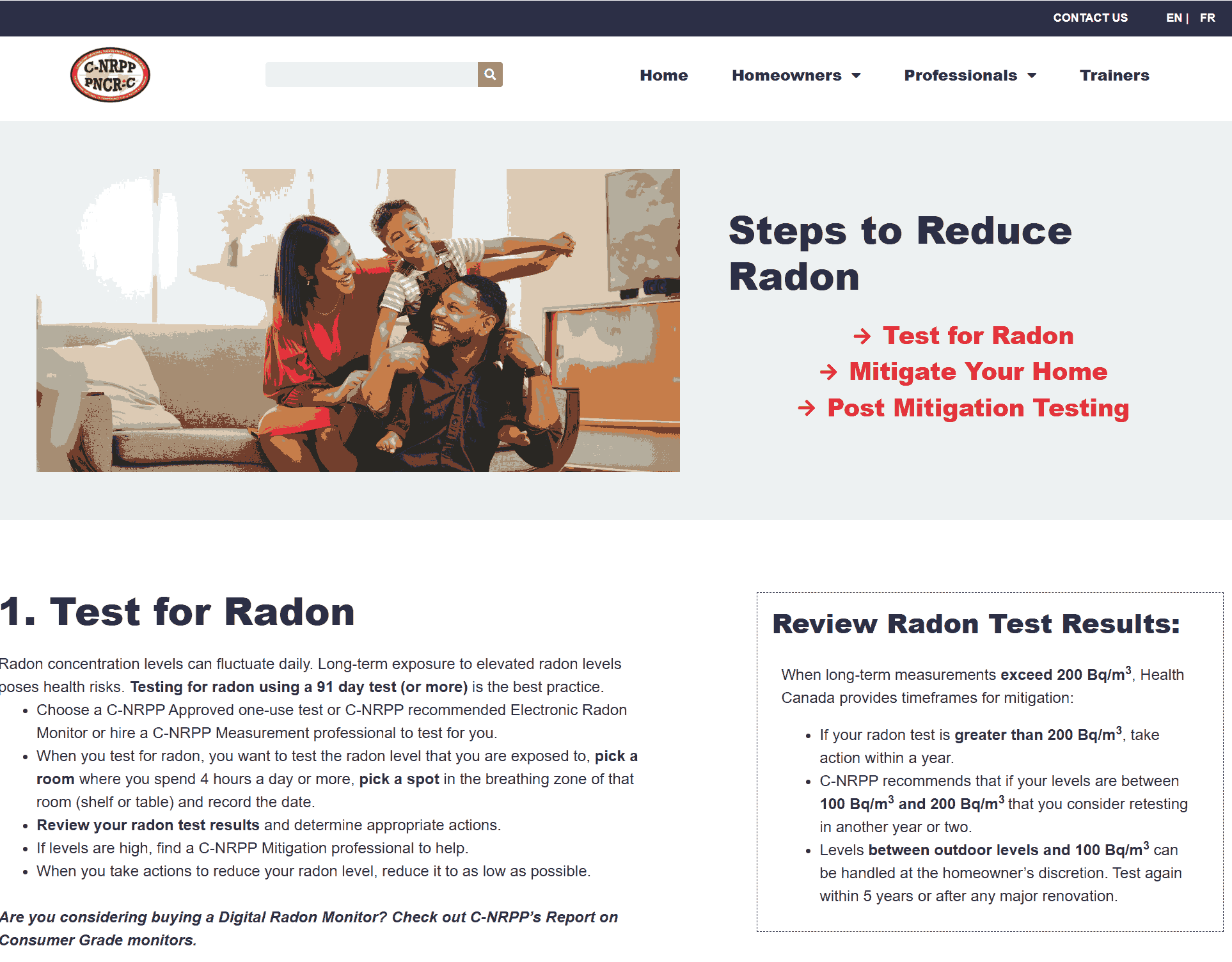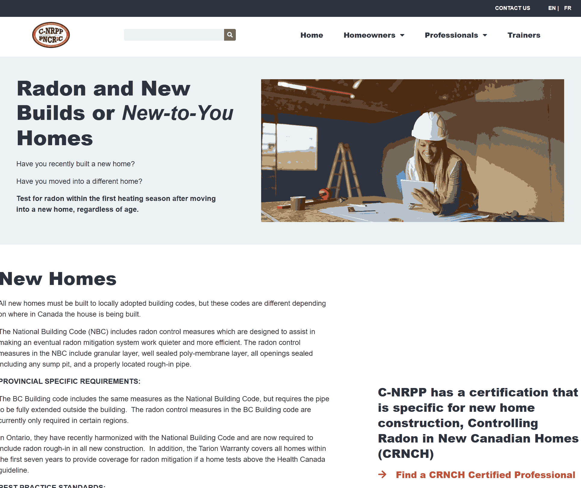 All new homes should still be tested during the first heating season - building codes and rough-ins alone don’t guarantee low radon levels. The National Building Code of Canada and many provincial codes require a radon-control rough-in (e.g., granular layer, sealed membrane, rough-in pipe) in new construction. In Ontario, warranties may cover mitigation if levels exceed the guideline. If you’re building or moving into a new home, ask for a builder who uses a C-NRPP “CRNCH”-certified professional to ensure proper radon-control measures. c-nrpp.ca