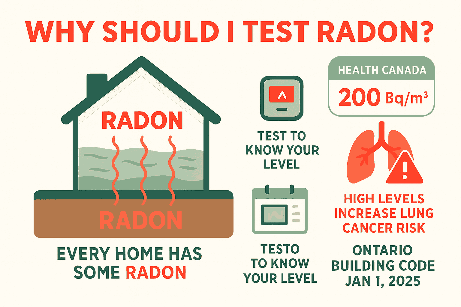 Health Canada recommends taking action if levels exceed 200 Bq/m³, and the Ontario Building Code now requires radon system rough-ins in new homes starting January 1, 2025.