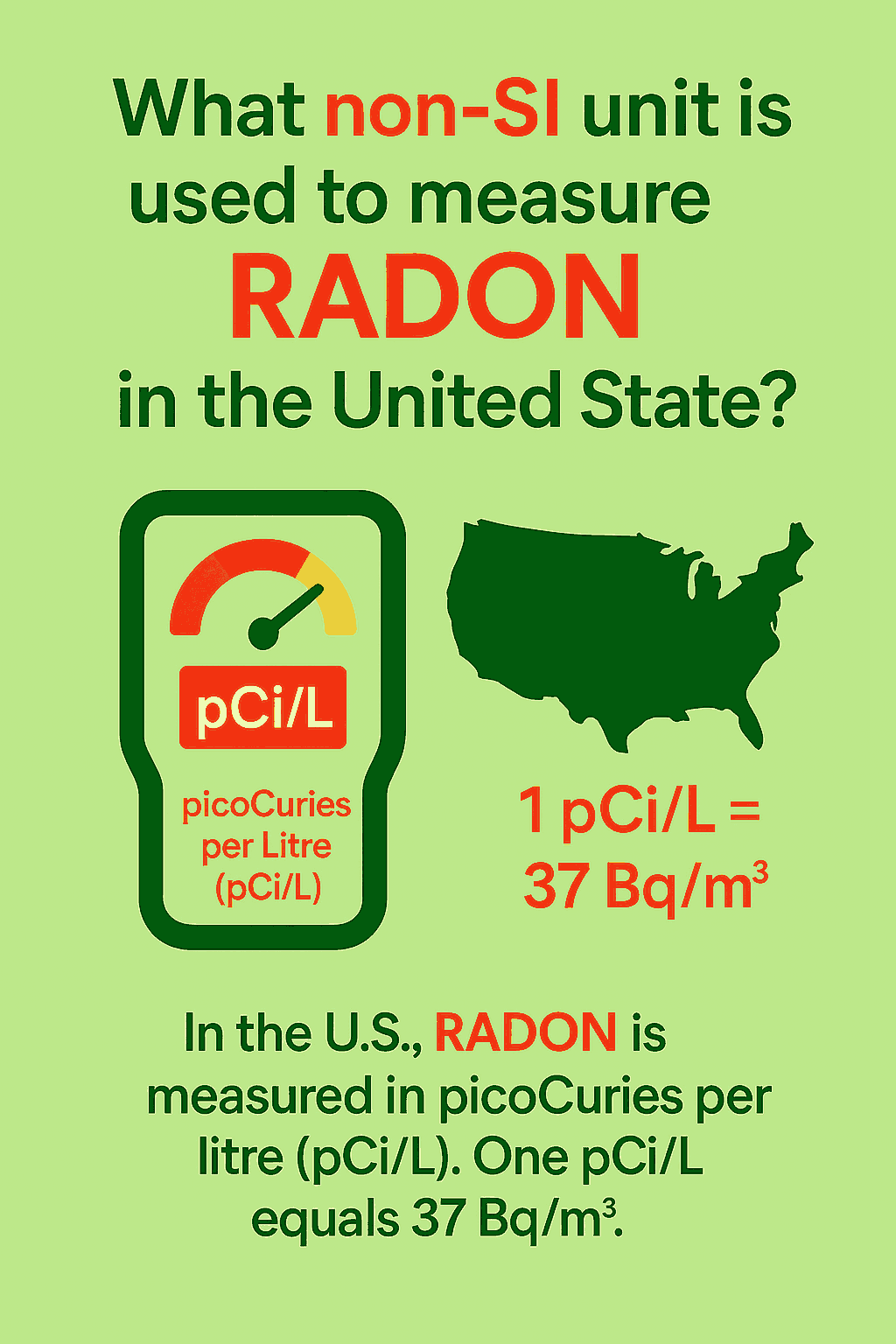 In the U.S., RADON is measured in picoCuries per litre (pCi/L).