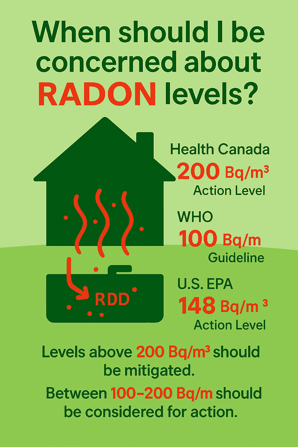 Levels between 100 – 200 Bq/m³ should also be considered for mitigation, since the World Health Organization’s guideline is 100 Bq/m³ and the U.S. EPA’s action level is 148 Bq/m³.