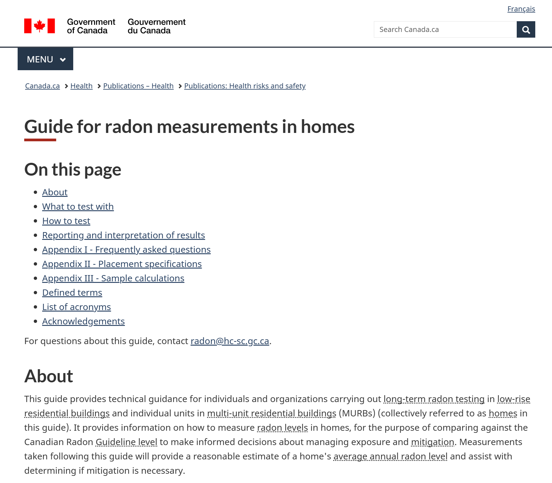 Health Canada’s guide provides technical instructions for measuring radon in homes - covering device selection, placement, testing duration (minimum 91 days), and result interpretation. Canada It reinforces that testing is the only way to determine actual radon levels, since radon is invisible and varies greatly even between neighbouring homes. Canada The national guideline recommends corrective action if the average annual radon level exceeds 200 Bq/m³; the principle of “as low as reasonably achievable” still applies. Canada Devices must be placed in a normal-occupancy room on the lowest lived-in level, and testing should ideally occur during the heating season for a realistic annual estimate. Canada