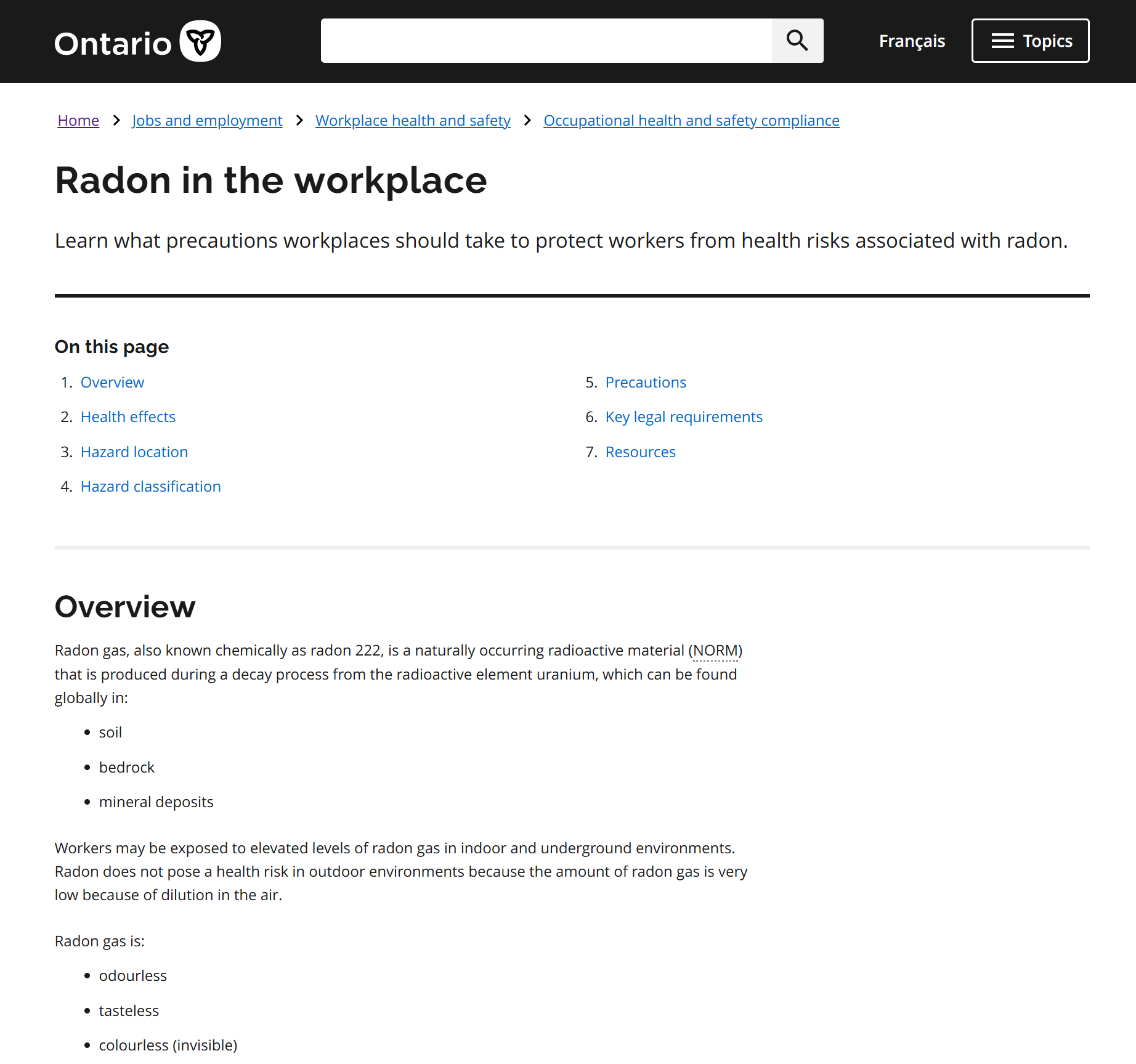 Workplace radon is a serious health concern. Under the Occupational Health & Safety Act, employers in Ontario have a general duty to protect workers from radon exposure. Testing is the only way to know if radon levels are elevated. If measured radon exceeds the guideline of 200 Bq/m³, mitigation is strongly advised. Employers should include radon in their hazard-assessments, implement a monitoring programme, and take corrective action when necessary.