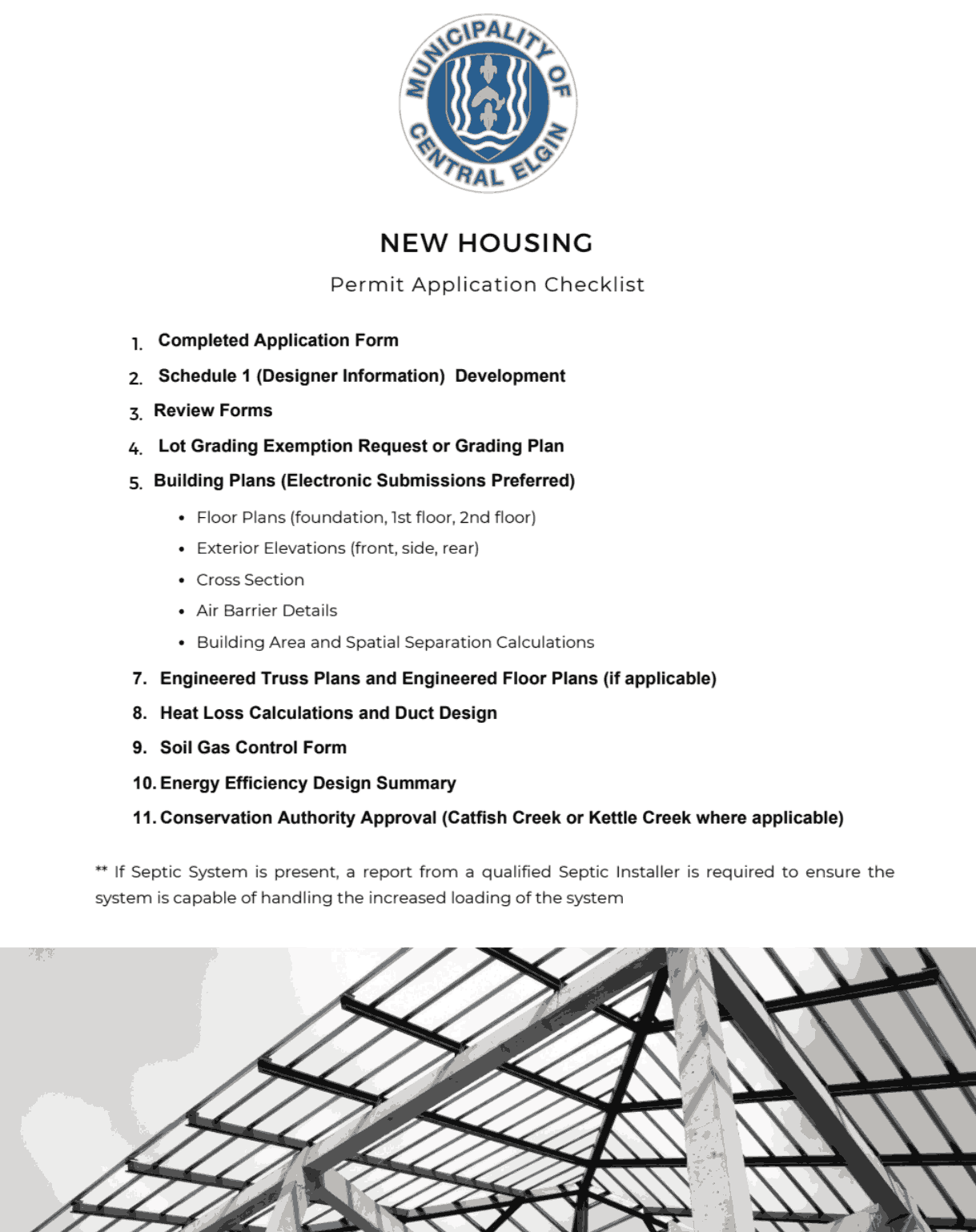 To obtain a building permit for new housing in Ontario, applicants must submit a complete permit package, including the Application to Construct or Demolish, Designer Information (BCIN), Development Review Form, Lot Grading Plan, Building Drawings, and Soil Gas Control Form following the Ontario Building Code. Energy efficiency and air barrier details must comply with SB-12 and SB-9 standards. A security deposit (up to $1,000) ensures project completion. Builders must also verify Tarion Warranty registration for new homes. Incomplete applications are rejected and must be resubmitted for permit approval.