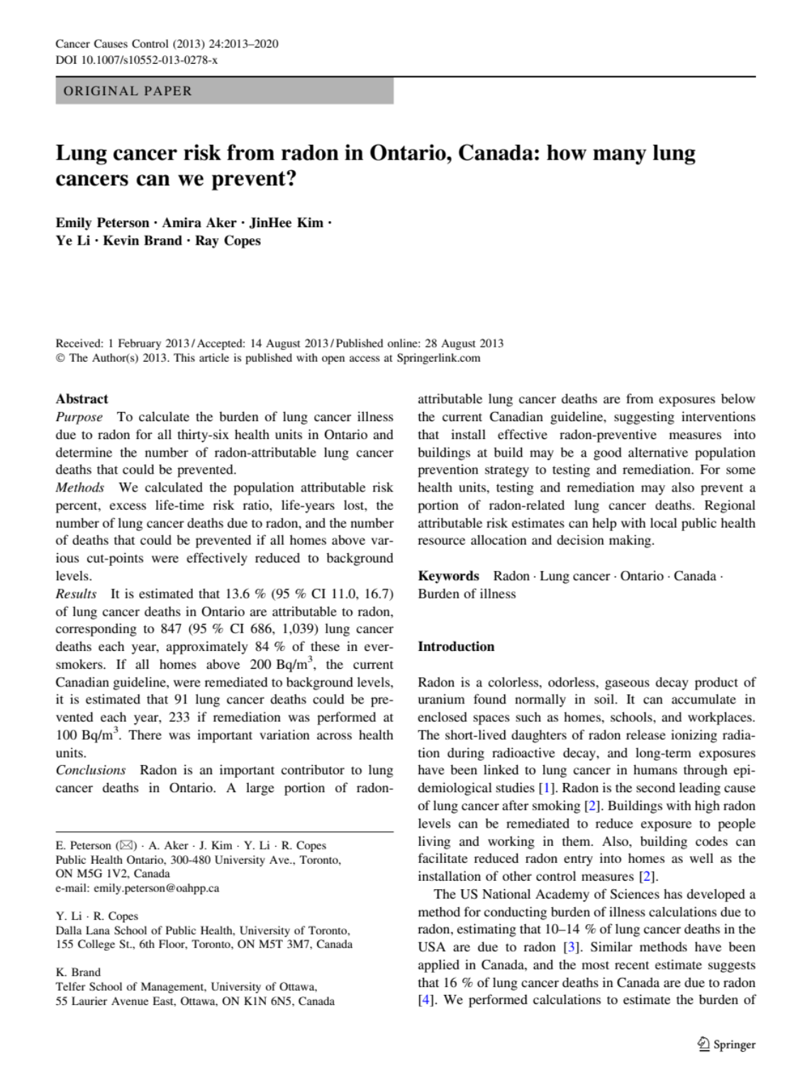 In Ontario, about 13.6% of lung cancer deaths - approximately 847 per year - are attributed to indoor radon exposure. PubMed+1 Remediating homes with radon levels above 200 Bq/m³ could prevent roughly 91 deaths annually, while reducing levels above 100 Bq/m³ could avert about 233 deaths each year. The vast majority (~84%) of these radon-related deaths occur among individuals who have ever smoked. The study highlights that radon exposure below the current guideline still poses a significant risk, underscoring the need for widespread testing and mitigation in all homes. PMC