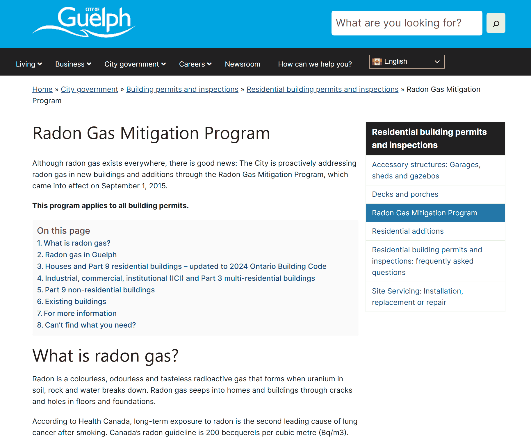 At the City of Guelph, new residential construction must comply with the Ontario Building Code’s soil-gas and radon mitigation requirements. Canada Projects requiring a building permit include those with radon mitigation system installations or active soil-gas control features. City of Guelph A dedicated “Radon Certification Form” must be submitted upon completion to verify compliance. City of Guelph This ensures new homes in Guelph are built to minimize radon risk from the ground up.